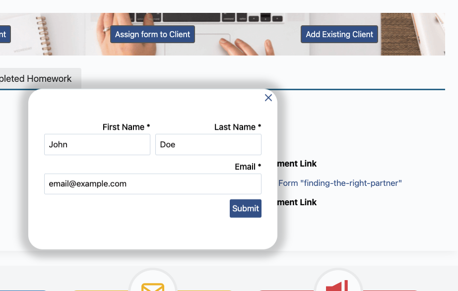 Fill the form out with the name and email of the person that you want to add and they will be added to your client list. The new client will be sent an email that they have been added to the system and to log in and choose their password.