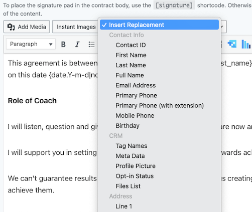 - You can insert replacement codes for many different uses. If you use the owner name, it will automatically use the owner of the contract which would be how you are logged in when you create it. YOU ARE THE OWNER.