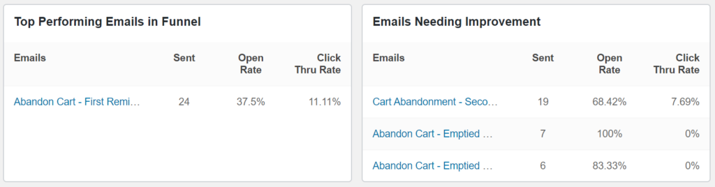 We pull together the numbers for all the emails in your funnel and put them into different categories. Emails with an open rate of over 20% and a Click-through rate of over 10% are considered emails that are performing well.