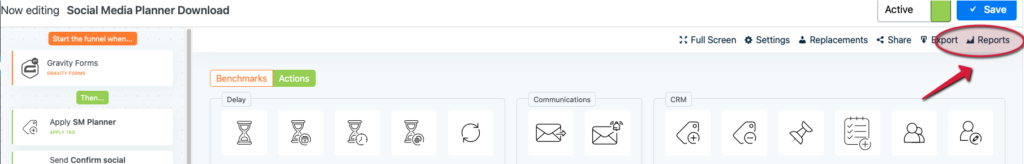 Go to the Business Suite Dashboard/Marketing Report or from where you edit the funnel and click the reports button.