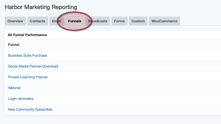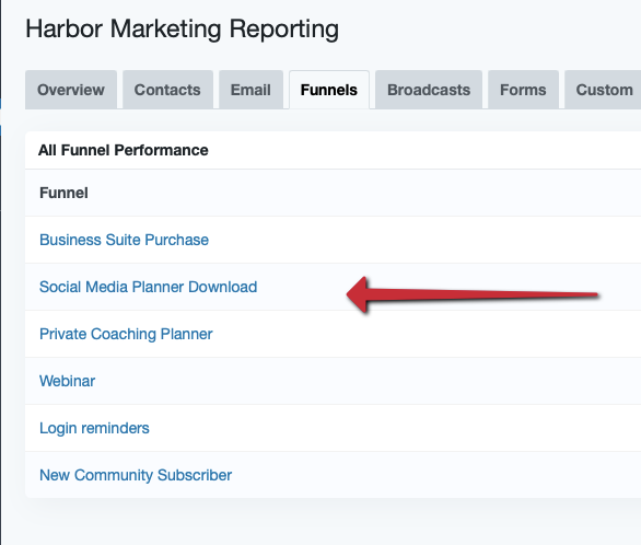 The first report you’ll see is a visual of the number of contacts that have completed the different benchmarks in your funnel!