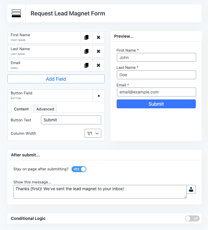 Next is deciding where you want to send the contact after they have filled out the form or have them stay on the page with a message. Conditional logic will allow you to complete depending on certain conditions.